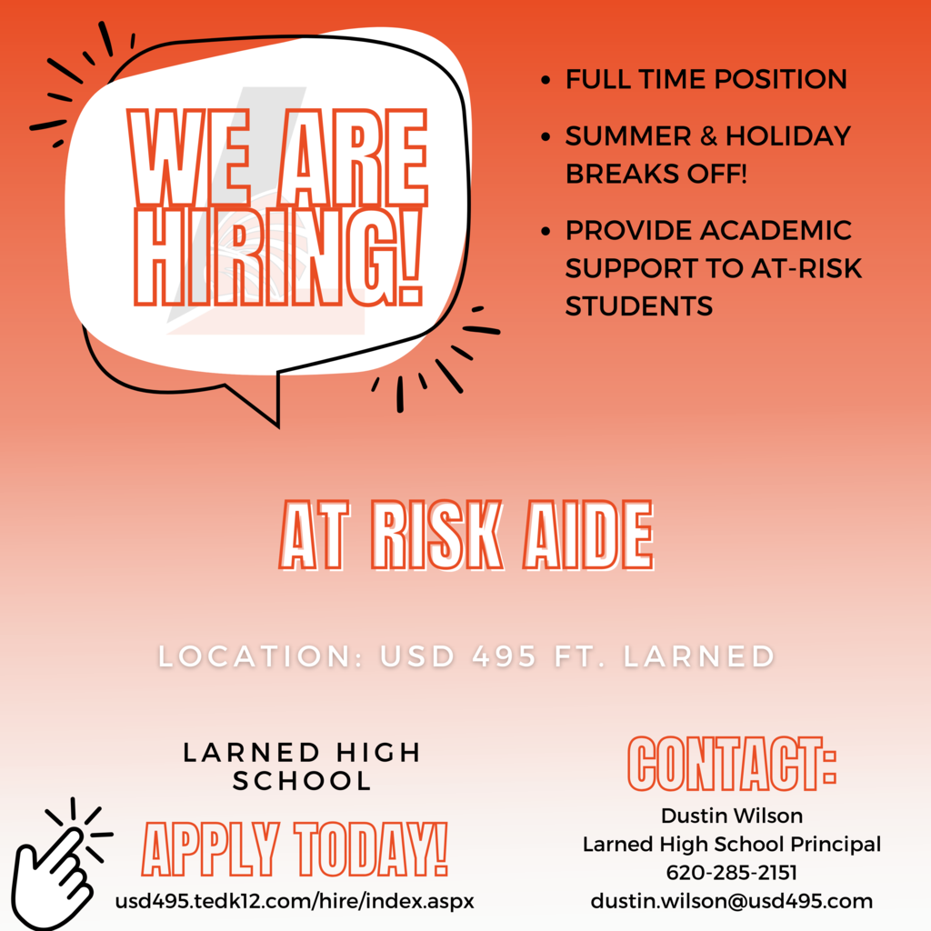 Join the Tri-County team! We're always on the look out for paraprofessionals and substitute paraprofessionals. Right now, we could use additional help at all 3 locations (Ft. Larned, Pawnee Heights, and Kinsley-Offerle) and with all ages of students. This would be a great position for retirees and parents of young students. You will be off of work when your children are - holiday breaks, summers, and more. Tri-County is willing to be flexible with your schedule, (i.e. half days, part-time, etc.) If you're interested in learning more or applying for a position, visit https://usd495.tedk12.com/hire/ViewJob.aspx?JobID=153 #larnedpride